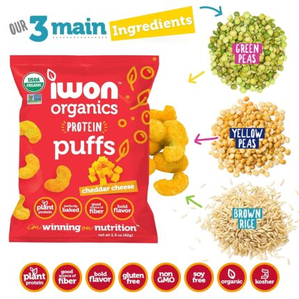 Iwon Organics Protein Puffs Cheddar Cheese Flavor, Vegan, Certified Non GMO, Certified Kosher, Soy Free, Gluten Fee, 5 Ounce (Pack